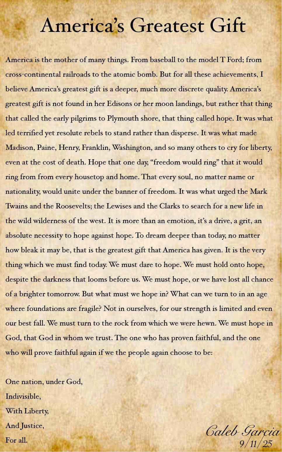 America is the mother of many things. From baseball to the model T Ford; from cross-continental railroads to the atomic bomb. But for all these achievements, I believe America’s greatest gift is a deeper, much more discrete quality. America’s greatest gift is not found in her Edisons or her moon landings, but rather that thing that called the early pilgrims to Plymouth shore, that thing called hope. It was what led terrified yet resolute rebels to stand rather than disperse. It was what made Madison, Paine, Henry, Franklin, Washington, and so many others to cry for liberty, even at the cost of death. Hope that one day, “freedom would ring” that it would ring from from every housetop and home. That every soul, no matter name or nationality, would unite under the banner of freedom. It was what urged the Mark Twains and the Roosevelts; the Lewises and the Clarks to search for a new life in the wild wilderness of the west. It is more than an emotion, it’s a drive, a grit, an absolute necessity to hope against hope. To dream deeper than today, no matter how bleak it may be, that is the greatest gift that America has given. It is the very thing which we must find today. We must dare to hope. We must hold onto hope, despite the darkness that looms before us. We must hope, or we have lost all chance of a brighter tomorrow. But what must we hope in? What can we turn to in an age where foundations are fragile? Not in ourselves, for our strength is limited and even our best fall. We must turn to the rock from which we were hewn. We must hope in God, that God in whom we trust. The one who has proven faithful, and the one who will prove faithful again if we the people again choose to be: